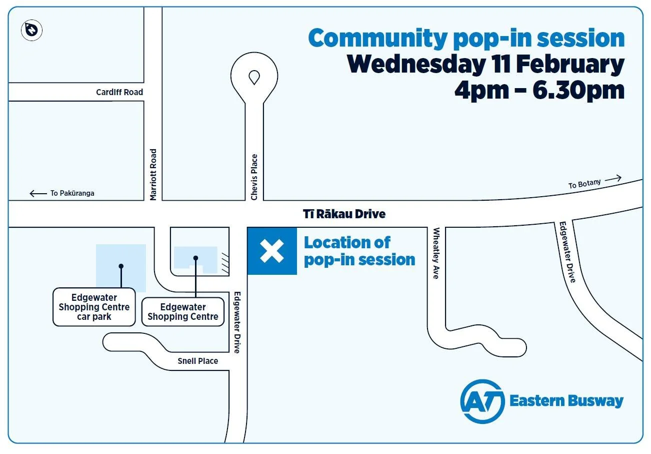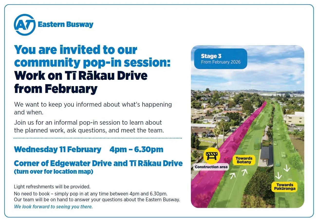 Eastern Busway is hosting a Community Pop-in event on Wednesday 11 February 4-6:30pm at the corner of Edgewater Drive and Ti Rākau Drive (near the shops).
